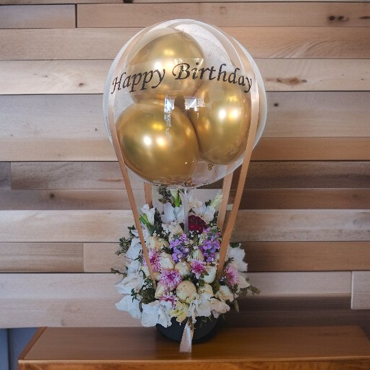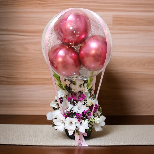 Thank you for reading this post, don't forget to subscribe!A beautiful arrangement of fresh flowers and balloons in a basket, perfect for special occasions like birthdays, anniversaries, or weddings. The vibrant colors and delicate petals of the flowers combined with the playful touch of balloons create a stunning visual display.
