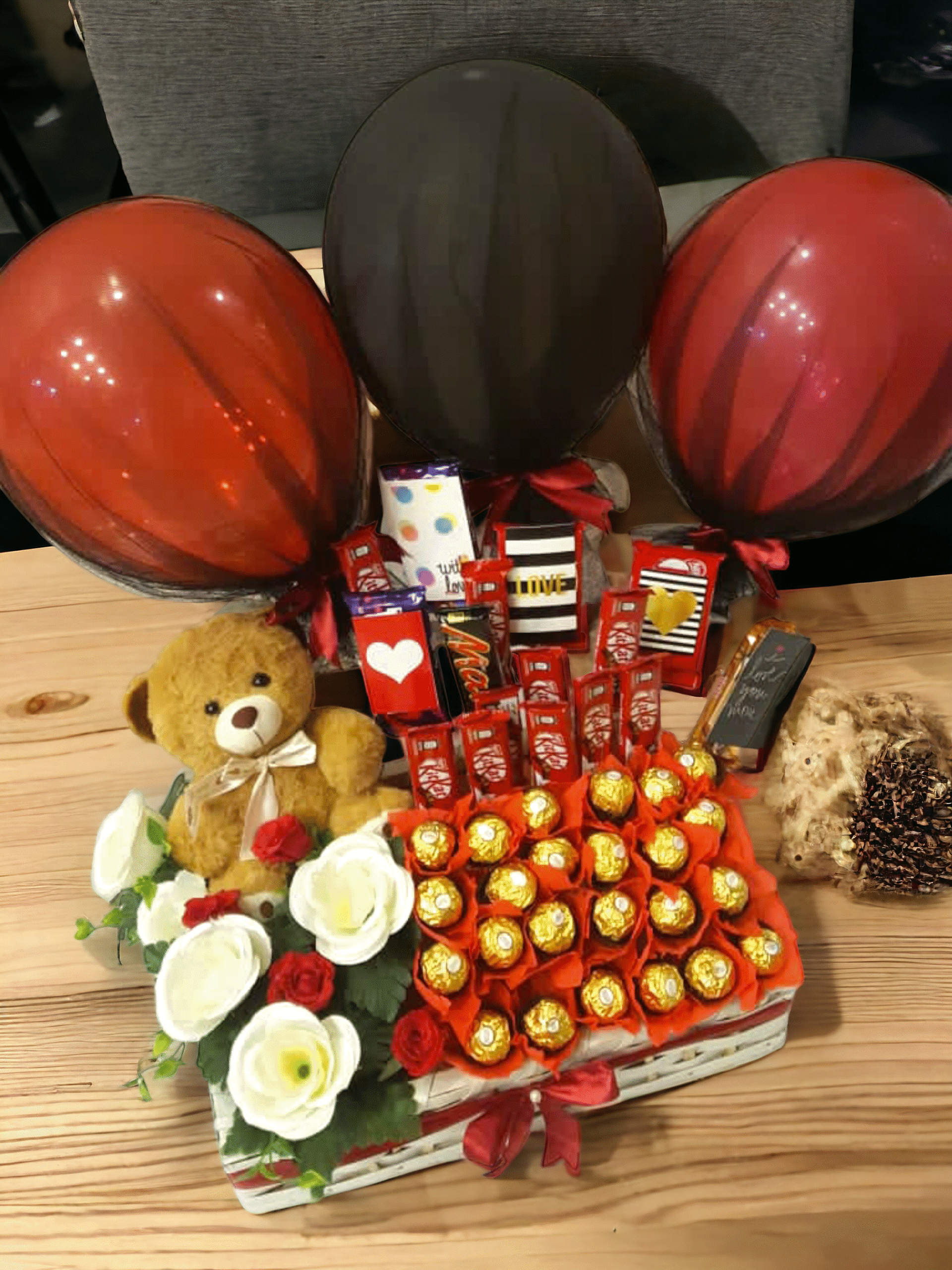 Special box birthday. Include items fresh Red roses balloons chocolate teddy bear mini size. etc