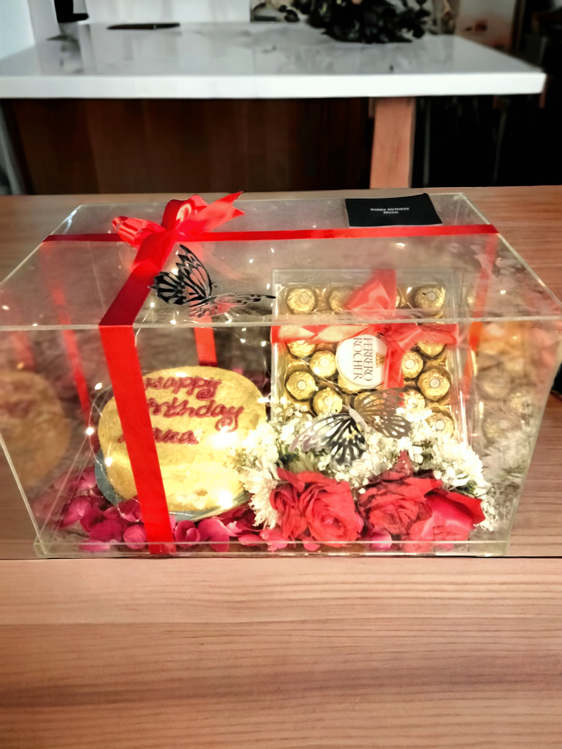 Special birthday. Acrylic box Layers Red velvet cake and FERRERO ROCHER CHOCOLATE BOX