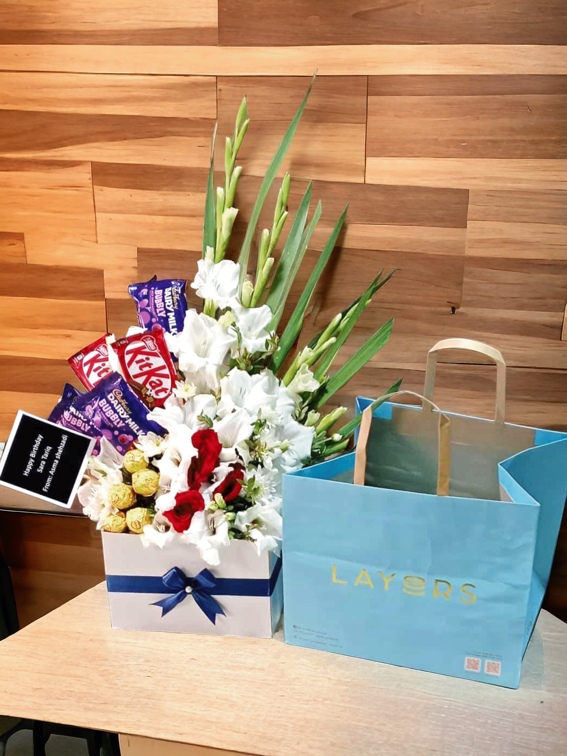Special birthday box .Layers Milky Malt Cake …Fresh flower and chocolate and card