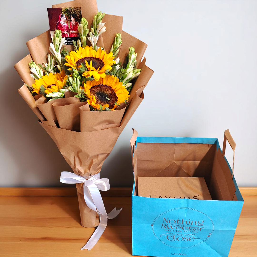 Fresh sunflower with baby breath bouque Milky Malt Cake and card